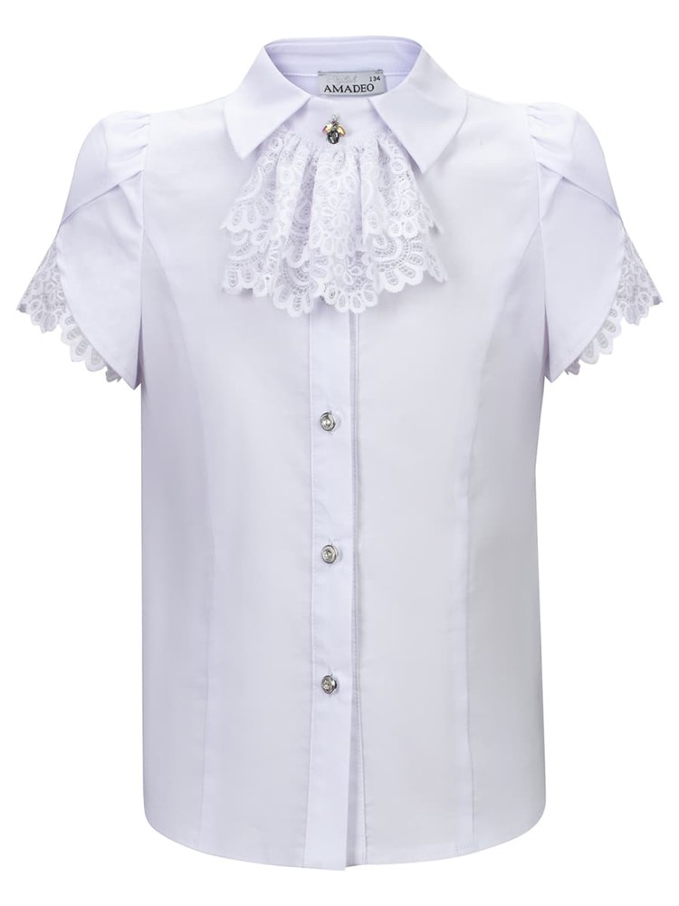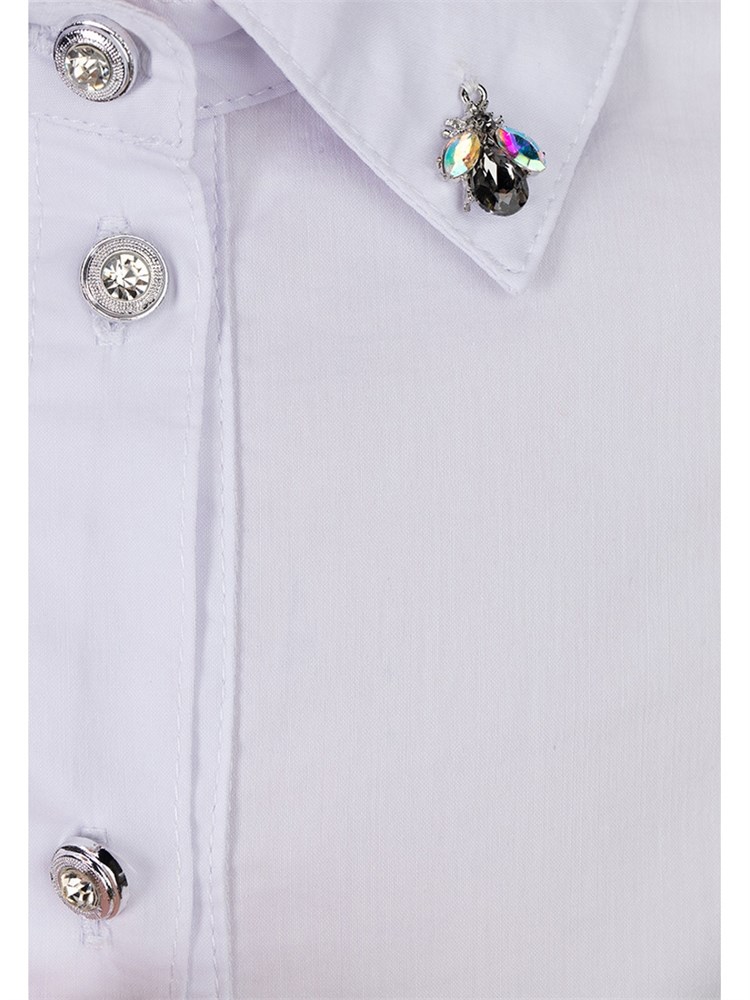 Блузка с длинным рукавом, воротник украшен "мушкой" со стразами, застегивается на декоративные пуговицы со стразами; Состав: Хлопок - 70%, Полиэстер - 27%, Эластан - 3%