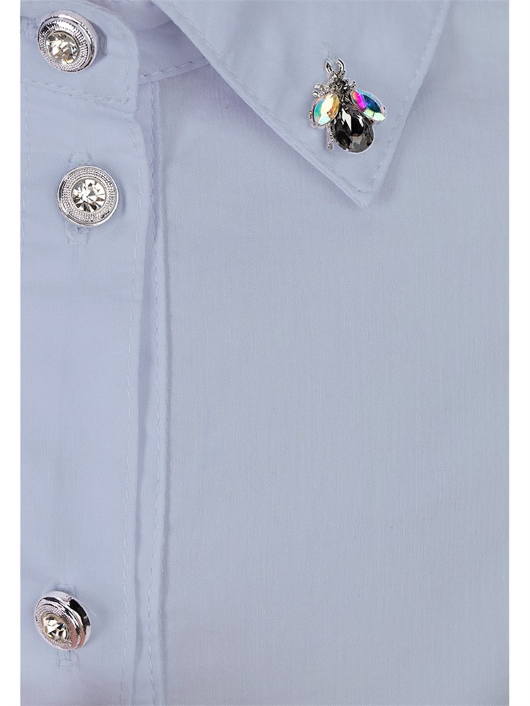 Блузка с длинным рукавом, воротник украшен "мушкой" со стразами, застегивается на декоративные пуговицы со стразами; Состав: Хлопок - 70%, Полиэстер - 27%, Эластан - 3%