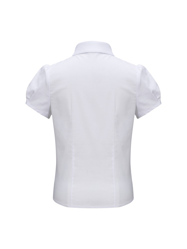 Блузка с коротким рукавом, воротник украшен "мушкой" со стразами, застегивается на декоративные пуговицы со стразами; Состав: Хлопок - 70%, Полиэстер - 27%, Эластан - 3%