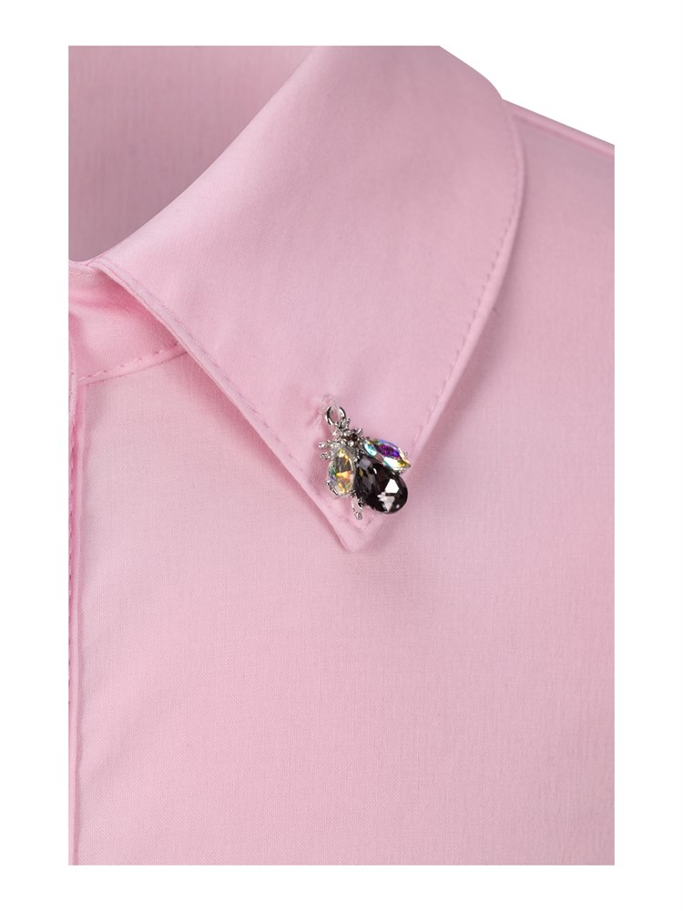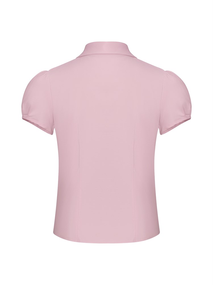 Блузка с коротким рукавом, воротник украшен "мушкой" со стразами, застегивается на декоративные пуговицы со стразами; Состав: Хлопок - 70%, Полиэстер - 27%, Эластан - 3%
