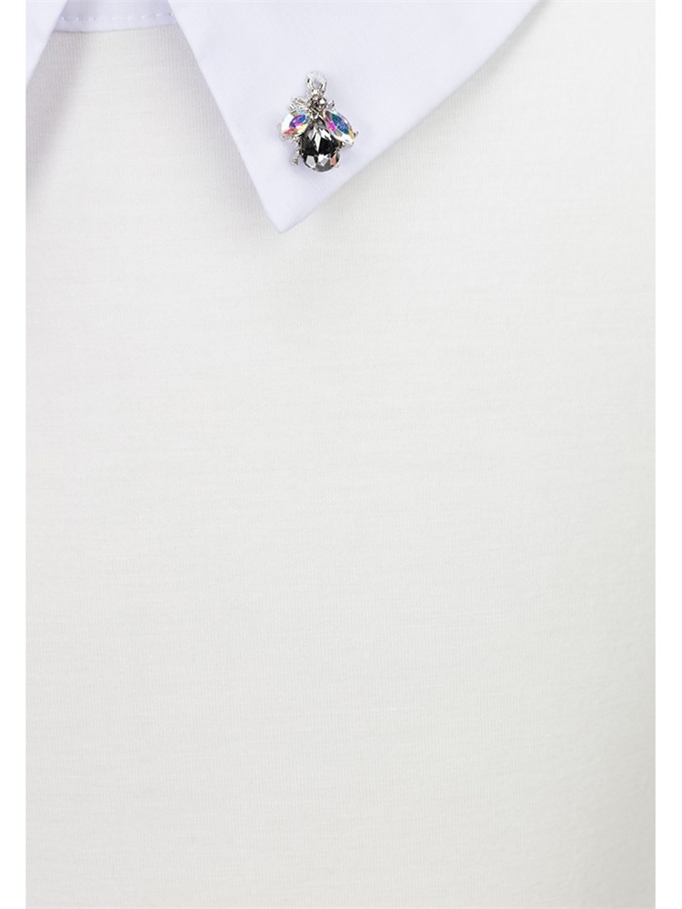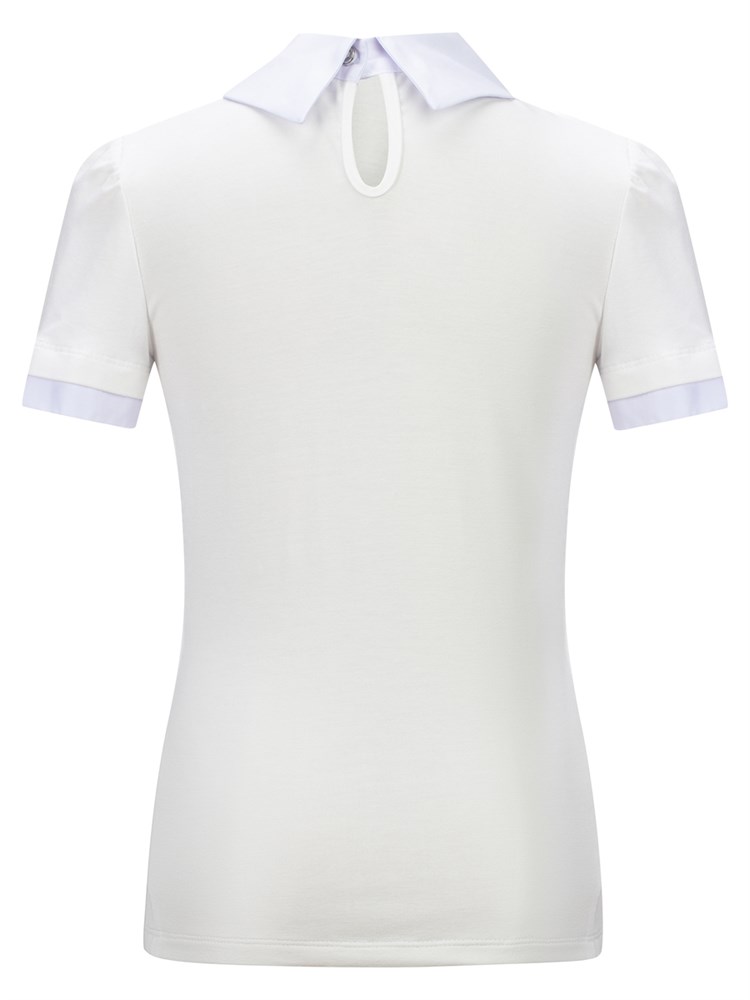Блузка с коротким рукавом, белым воротником, украшенным "мушкой" со стразами и белыми манжетами. Блузка застегивается сзади на пуговицу; Состав: Материал 1: Вискоза - 95%, Эластан - 5%; Материал 2: Хлопок - 70%, Полиэстер - 27%, Эластан - 3%
