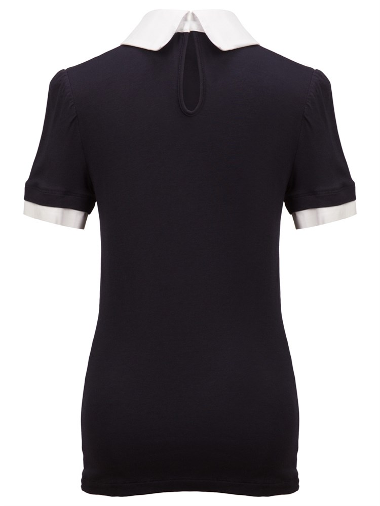 Блузка с коротким рукавом, белым воротником, украшенным "мушкой" со стразами и белыми манжетами. Блузка застегивается сзади на пуговицу; Состав: Материал 1: Вискоза - 95%, Эластан - 5%; Материал 2: Хлопок - 70%, Полиэстер - 27%, Эластан - 3%