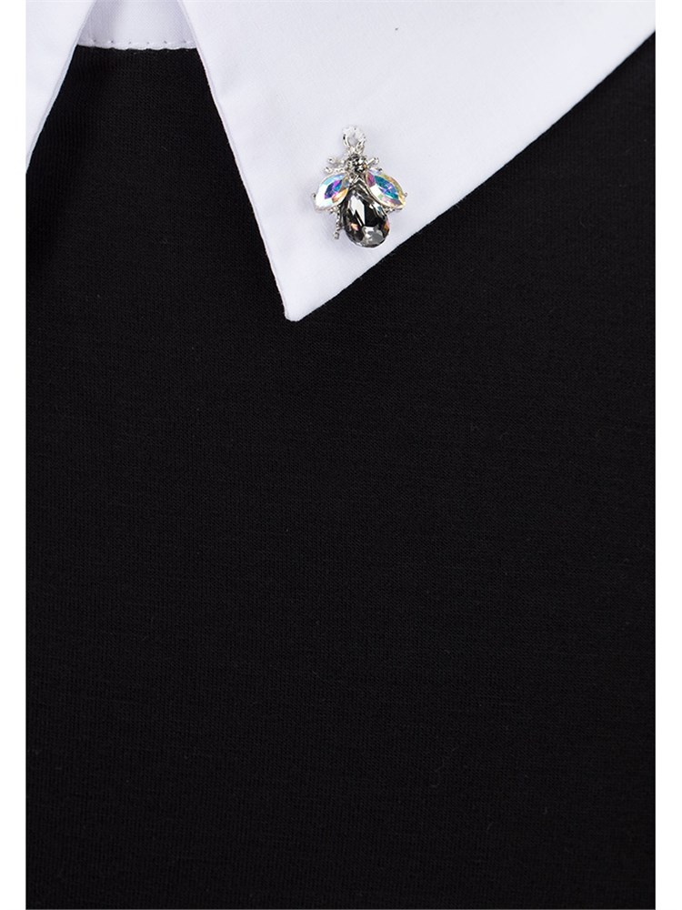 Блузка с коротким рукавом, белым воротником, украшенным "мушкой" со стразами и белыми манжетами. Блузка застегивается сзади на пуговицу; Состав: Материал 1: Вискоза - 95%, Эластан - 5%; Материал 2: Хлопок - 70%, Полиэстер - 27%, Эластан - 3%
