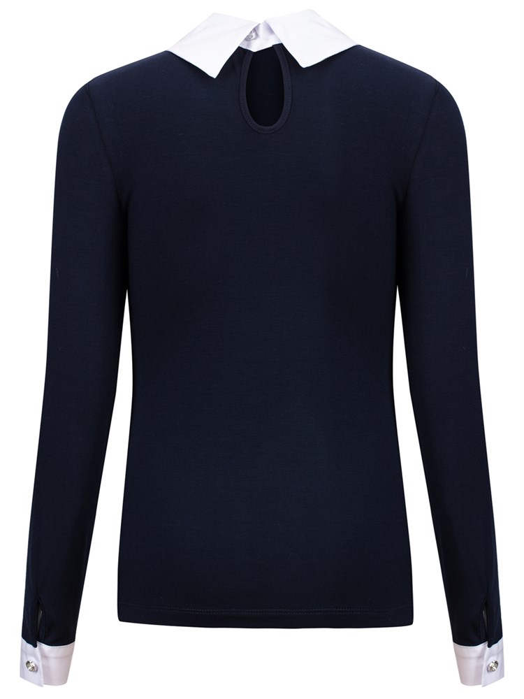 Блузка с длинным рукавом, украшенная белым воротником с декаративным украшением со стразами и белыми манжетами на рукавах, рукава застегиваются на декоративные пуговицы; Состав: Материал 1: Вискоза - 95%, Эластан - 5%; Материал 2: Хлопок - 70%, Полиэстер - 27%, Эластан - 3%