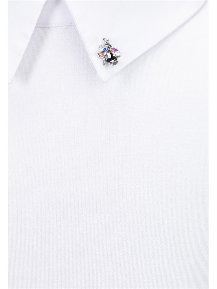 Блузка с длинным рукавом, украшенная белым воротником с декаративным украшением со стразами и белыми манжетами на рукавах, рукава застегиваются на декоративные пуговицы; Состав: Материал 1: Вискоза - 95%, Эластан - 5%; Материал 2: Хлопок - 70%, Полиэстер - 27%, Эластан - 3%