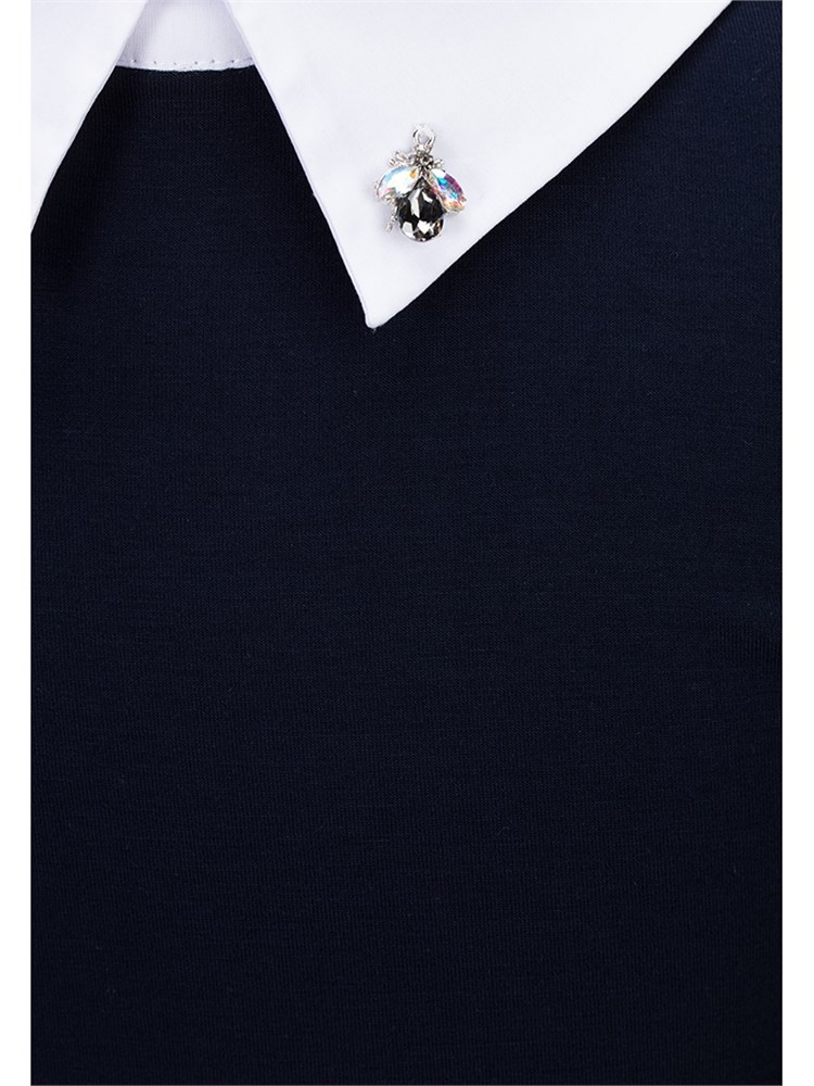 Блузка с длинным рукавом, украшенная белым воротником с декаративным украшением со стразами и белыми манжетами на рукавах, рукава застегиваются на декоративные пуговицы; Состав: Материал 1: Вискоза - 95%, Эластан - 5%; Материал 2: Хлопок - 70%, Полиэстер - 27%, Эластан - 3%