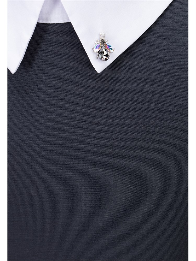 Блузка с длинным рукавом, украшенная белым воротником с декаративным украшением со стразами и белыми манжетами на рукавах, рукава застегиваются на декоративные пуговицы; Состав: Материал 1: Вискоза - 95%, Эластан - 5%; Материал 2: Хлопок - 70%, Полиэстер - 27%, Эластан - 3%
