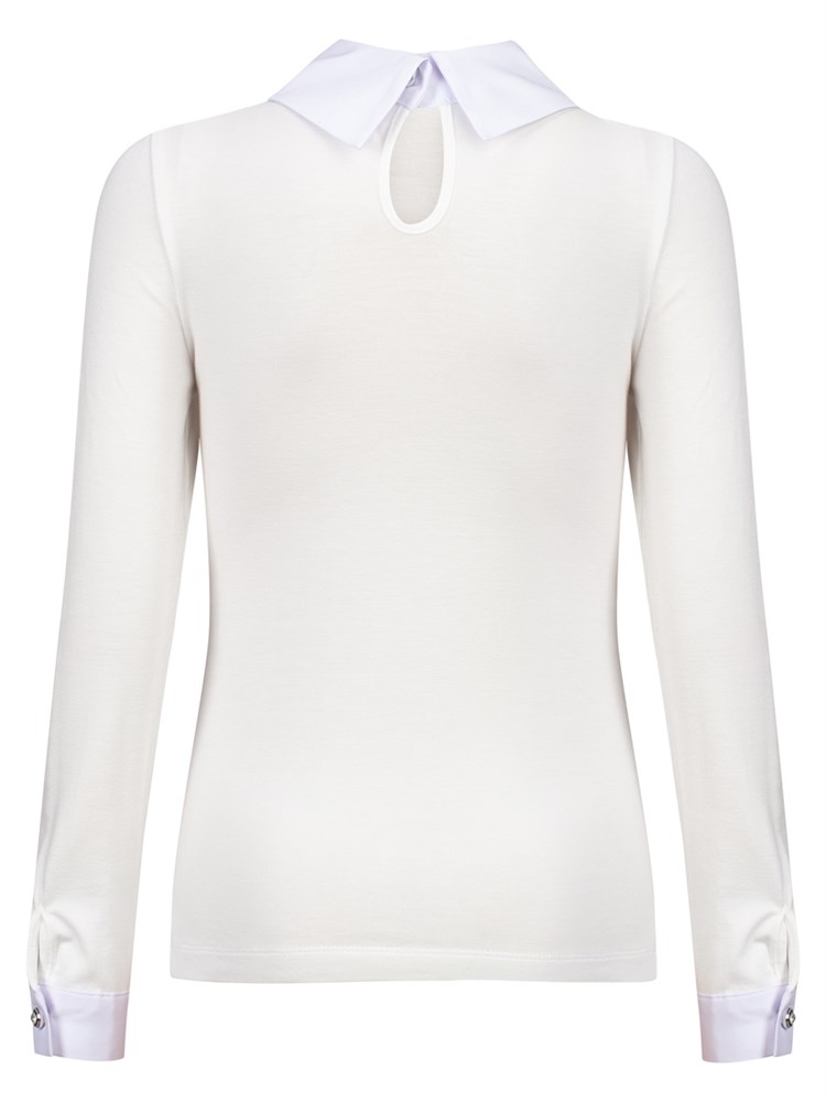 Блузка с длинным рукавом, украшенная белым воротником с декаративным украшением со стразами и белыми манжетами на рукавах, рукава застегиваются на декоративные пуговицы; Состав: Материал 1: Вискоза - 95%, Эластан - 5%; Материал 2: Хлопок - 70%, Полиэстер - 27%, Эластан - 3%
