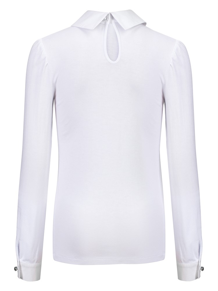 Блузка с длинным рукавом, украшенная белым воротником с декаративным украшением со стразами и белыми манжетами на рукавах, рукава застегиваются на декоративные пуговицы; Состав: Материал 1: Вискоза - 95%, Эластан - 5%; Материал 2: Хлопок - 70%, Полиэстер - 27%, Эластан - 3%