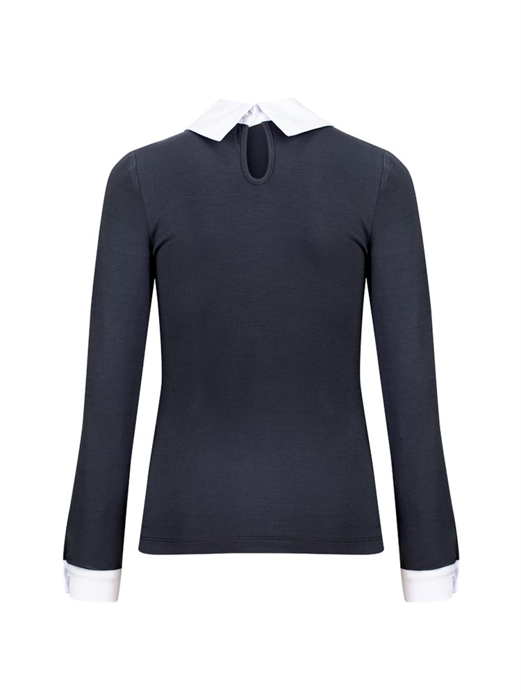 Блузка с длинным рукавом, украшенная белым воротником с декаративным украшением со стразами и белыми манжетами на рукавах, рукава застегиваются на декоративные пуговицы; Состав: Материал 1: Вискоза - 95%, Эластан - 5%; Материал 2: Хлопок - 70%, Полиэстер - 27%, Эластан - 3%