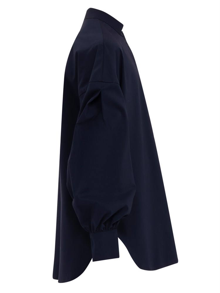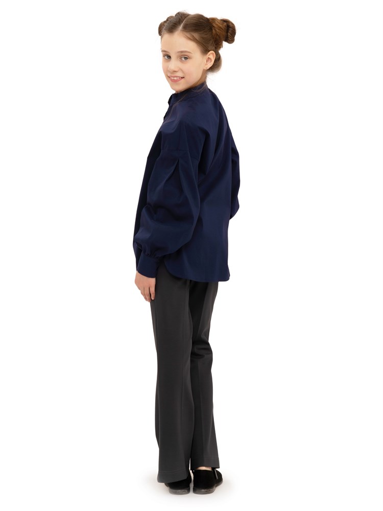 Современная молодежная блузка оверсайз. Свободный крой. Широкие рукава. Воротник стойка. Представленная модель рубашки может использоваться как школьная форма для детей, а также как праздничная нарядная блузка; Состав: Хлопок - 70%, Полиэстер - 27%, Эластан - 3%.