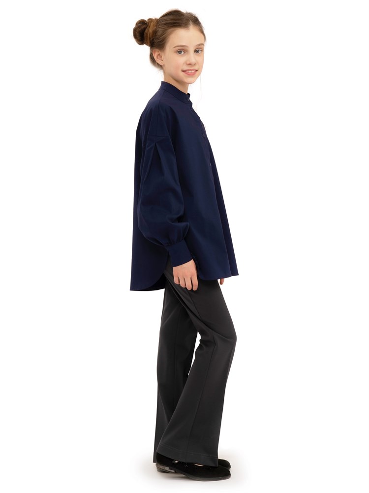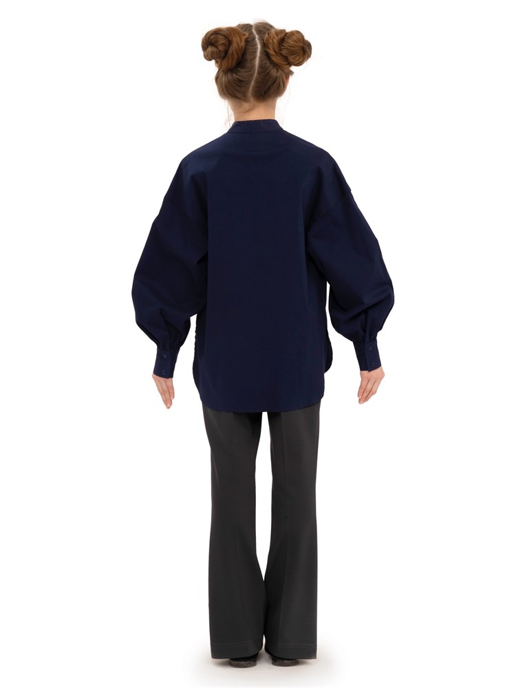 Современная молодежная блузка оверсайз. Свободный крой. Широкие рукава. Воротник стойка. Представленная модель рубашки может использоваться как школьная форма для детей, а также как праздничная нарядная блузка; Состав: Хлопок - 70%, Полиэстер - 27%, Эластан - 3%.
