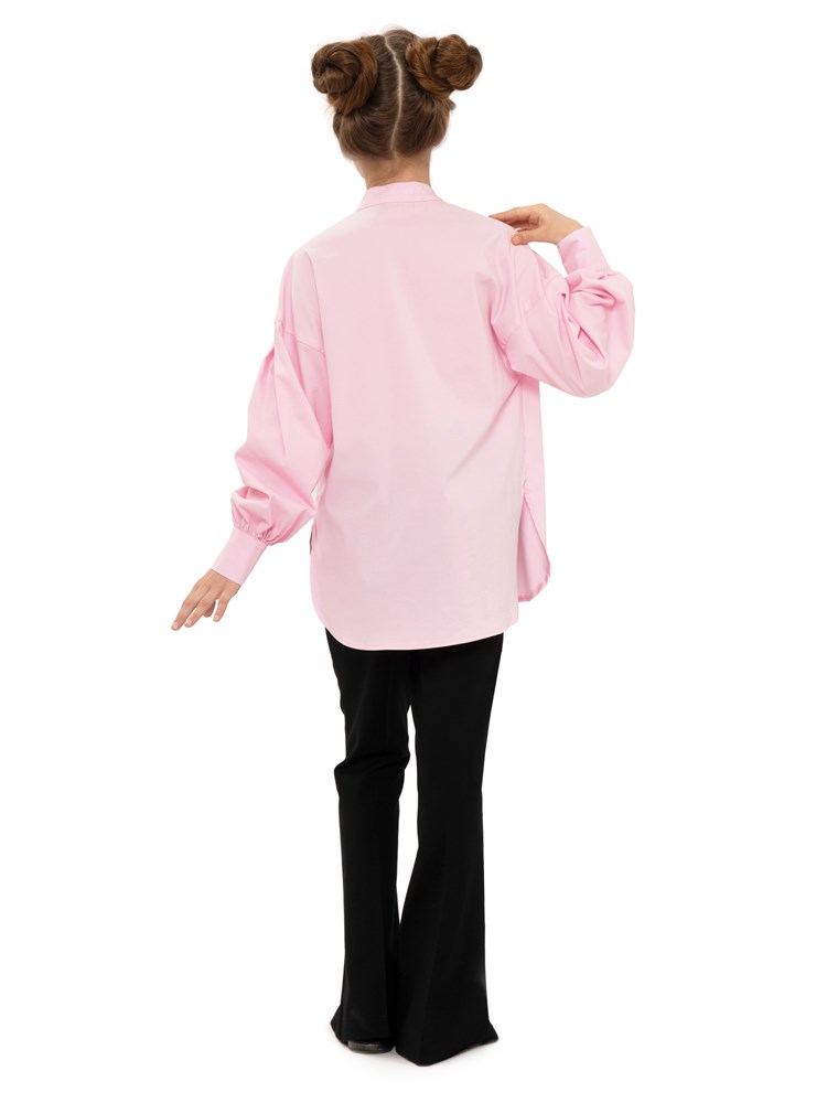Современная молодежная блузка оверсайз. Свободный крой. Широкие рукава. Воротник стойка. Представленная модель рубашки может использоваться как школьная форма для детей, а также как праздничная нарядная блузка; Состав: Хлопок - 70%, Полиэстер - 27%, Эластан - 3%.