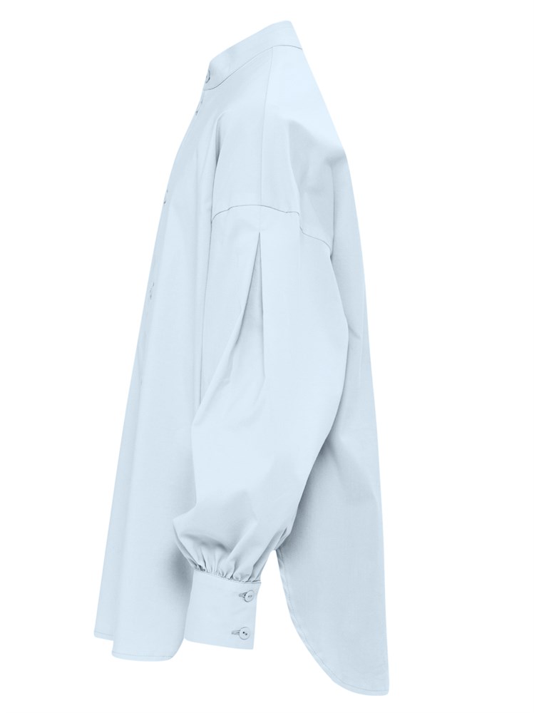 Современная молодежная блузка оверсайз. Свободный крой. Широкие рукава. Воротник стойка. Представленная модель рубашки может использоваться как школьная форма для детей, а также как праздничная нарядная блузка; Состав: Хлопок - 70%, Полиэстер - 27%, Эластан - 3%.