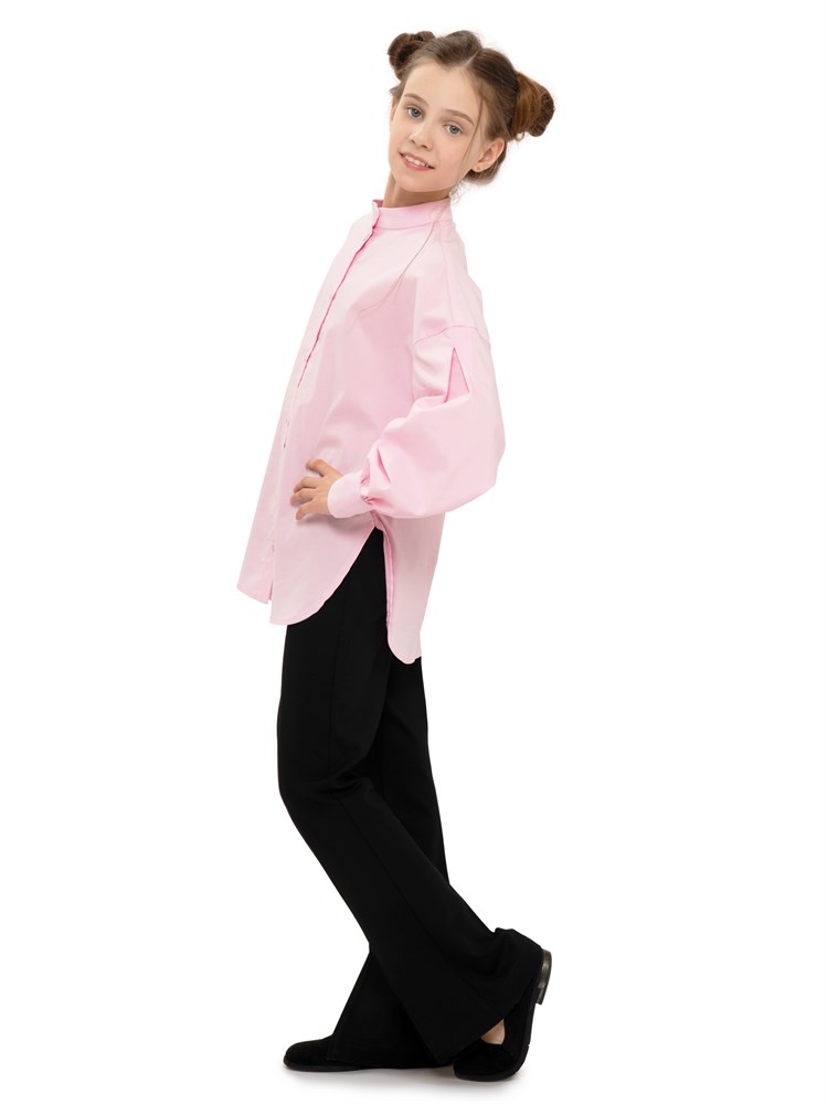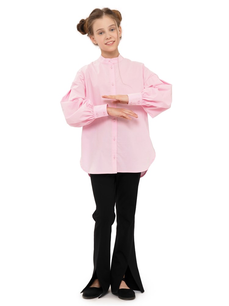 Современная молодежная блузка оверсайз. Свободный крой. Широкие рукава. Воротник стойка. Представленная модель рубашки может использоваться как школьная форма для детей, а также как праздничная нарядная блузка; Состав: Хлопок - 70%, Полиэстер - 27%, Эластан - 3%.