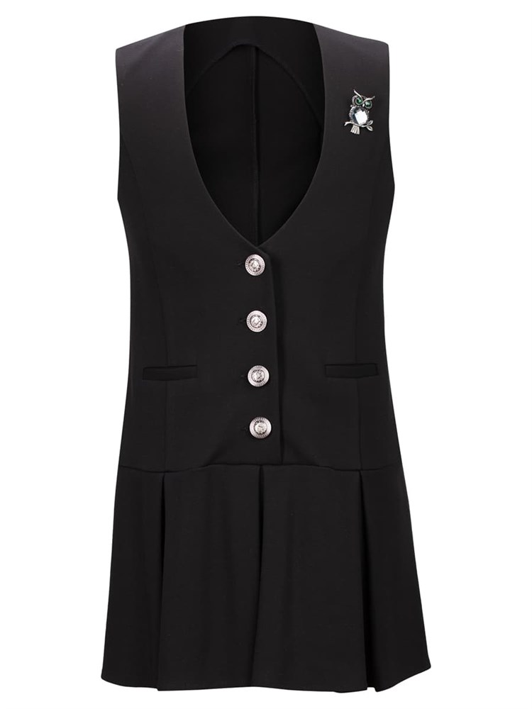 Сарафан для девочки без рукавов, на серебристых декоративных пуговицах с двух сторон; Состав: Вискоза - 60%, Нейлон - 35 %, Эластан - 5%.