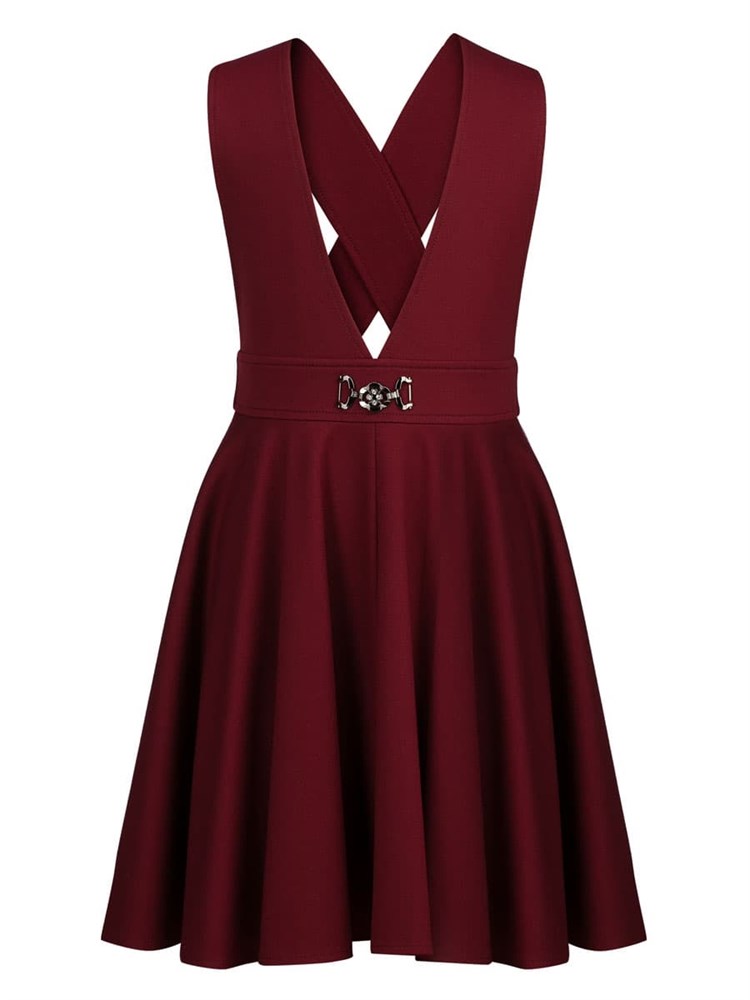 Сарафан для девочки без рукавов, на толстых лямках, перекрещивающихся на спине, юбка-клеш, с декоративной брошью со стразамина поясе; Состав: Вискоза - 60%, Нейлон - 35 %, Эластан - 5%.