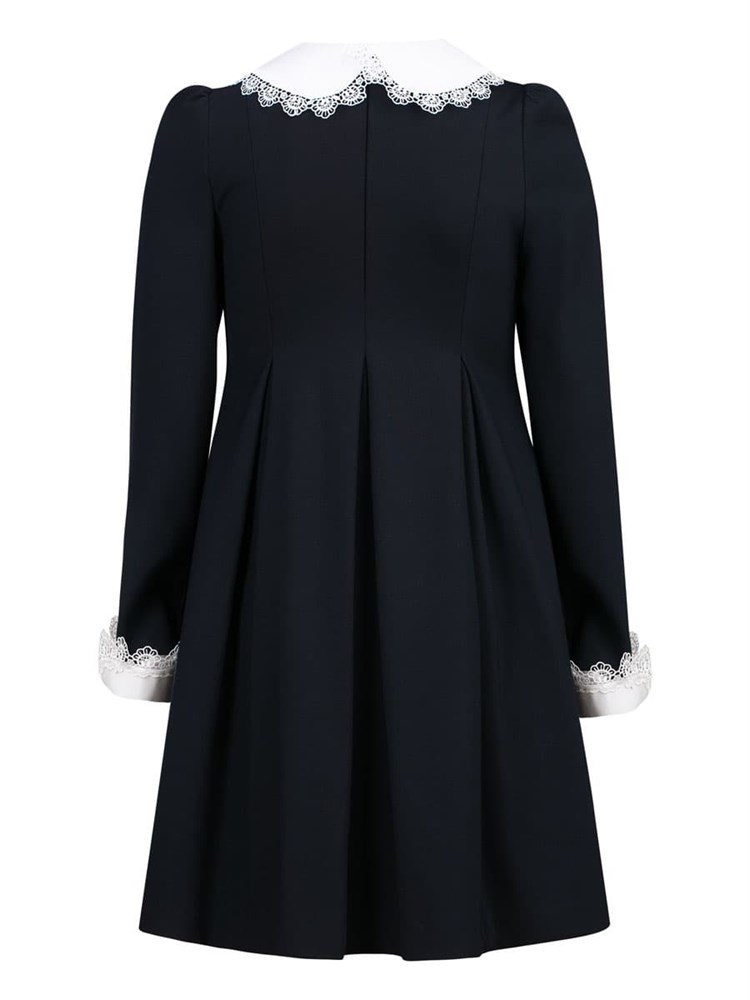 Платье с длинным рукавом А-силуэта с расклешенной юбкой, украшено кружевом, воротник и манжеты отстегиваются; Состав: Вискоза - 60%, Нейлон - 35%, Эластан - 5%