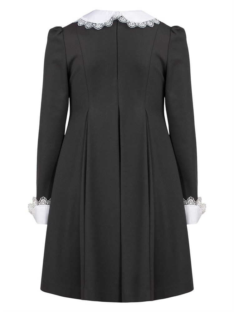 Платье с длинным рукавом А-силуэта с расклешенной юбкой, украшено кружевом, воротник и манжеты отстегиваются; Состав: Вискоза - 60%, Нейлон - 35%, Эластан - 5%