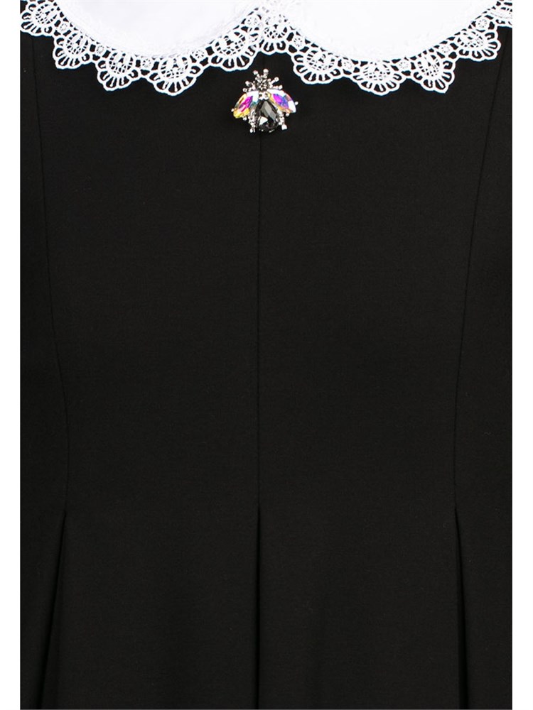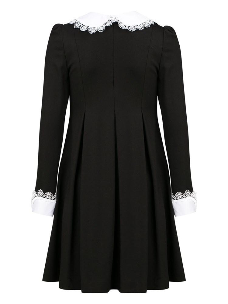 Платье с длинным рукавом А-силуэта с расклешенной юбкой, украшено кружевом, воротник и манжеты отстегиваются; Состав: Вискоза - 60%, Нейлон - 35%, Эластан - 5%
