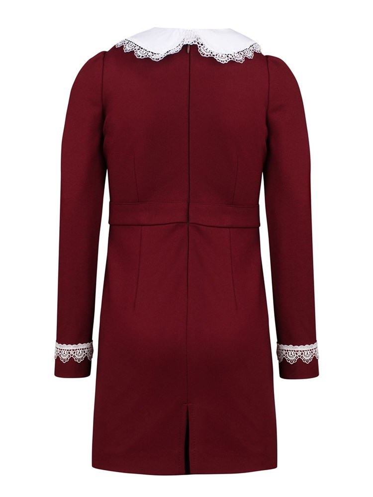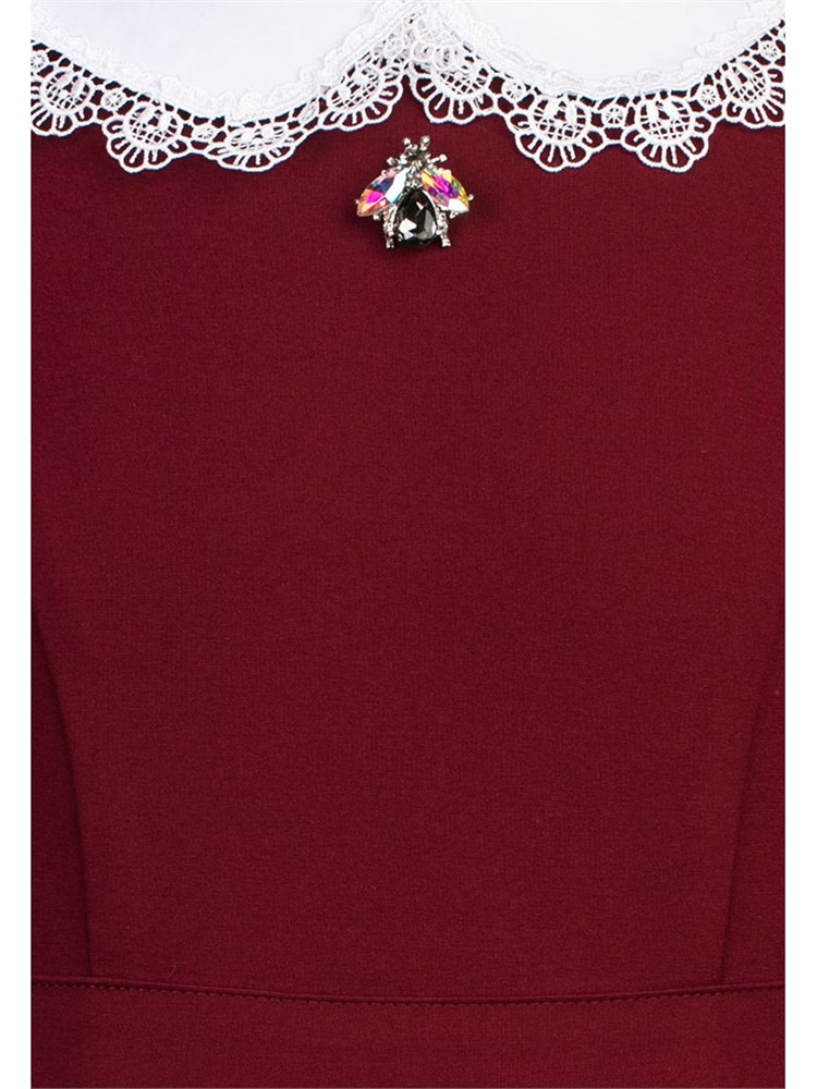 Приталенное платье-трапеция с длинным рукавом, украшено кружевом на воротнике и манжетах. Платье украшено декотивной мушкой со стразами. Застегивается сзади на молнию; Состав: Вискоза - 60%, Нейлон - 35%, Эластан - 5%