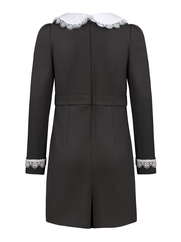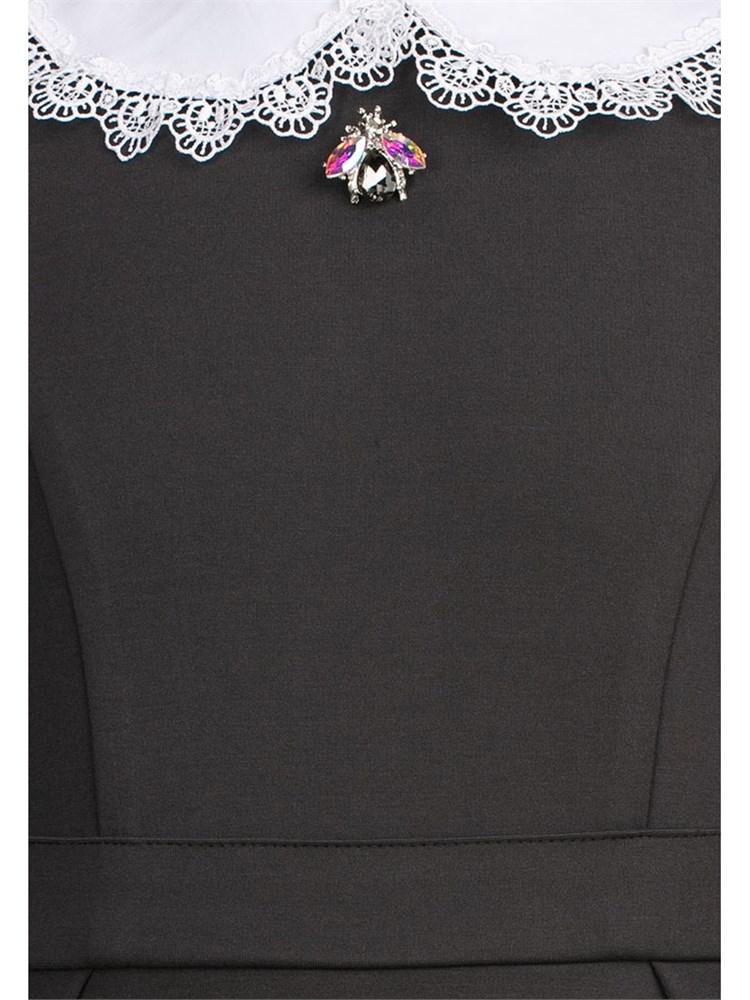 Приталенное платье-трапеция с длинным рукавом, украшено кружевом на воротнике и манжетах. Платье украшено декотивной мушкой со стразами. Застегивается сзади на молнию; Состав: Вискоза - 60%, Нейлон - 35%, Эластан - 5%