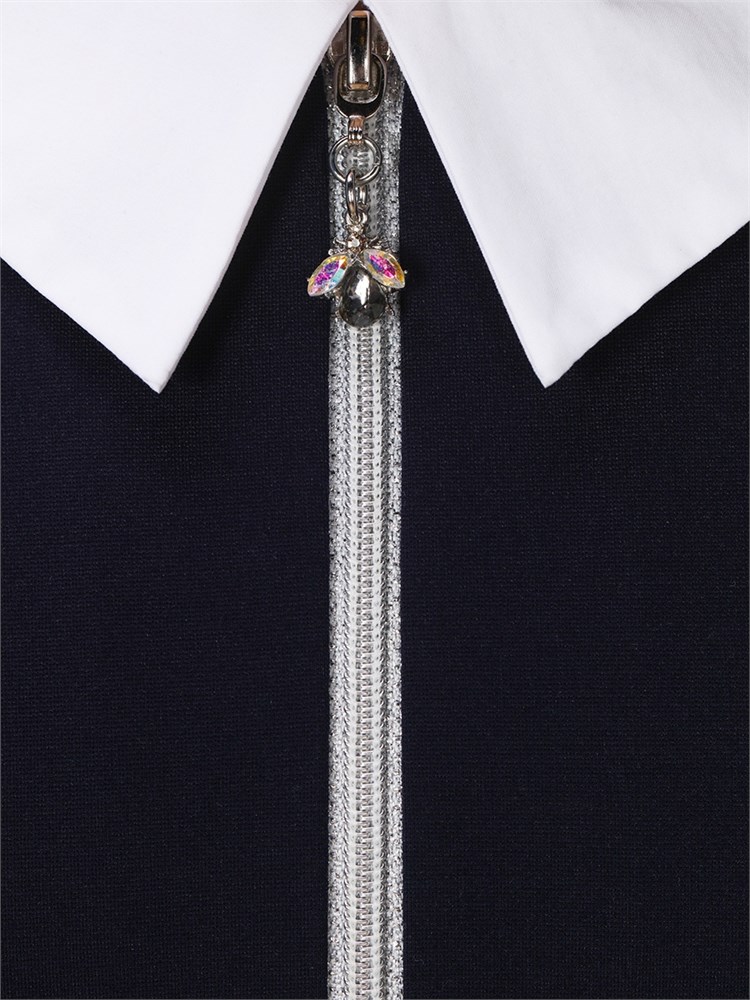 Платье с длинным рукавом, расклешенной юбкой, с декоративной молнией спереди. Украшено белым воротником-стойкой и белыми манжетами на рукавах; Состав: Вискоза - 60%, Нейлон - 35%, Эластан - 5%