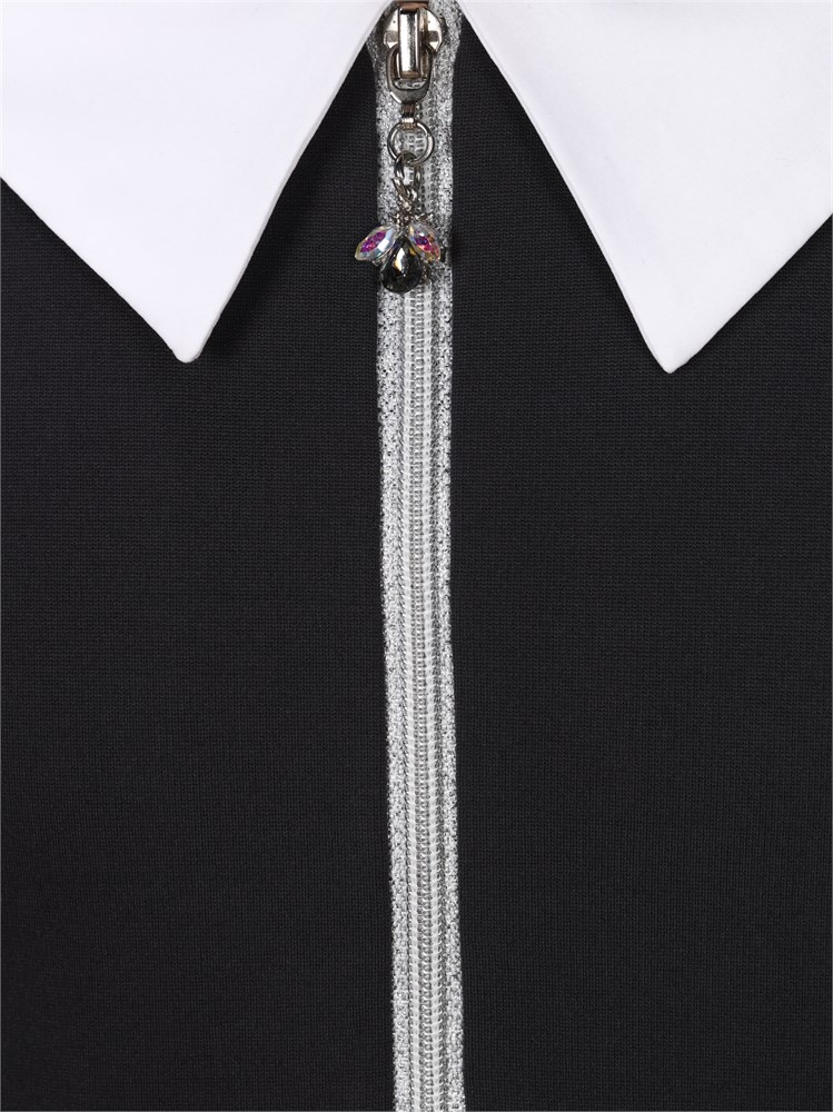 Платье с длинным рукавом, расклешенной юбкой, с декоративной молнией спереди. Украшено белым воротником-стойкой и белыми манжетами на рукавах; Состав: Вискоза - 60%, Нейлон - 35%, Эластан - 5%