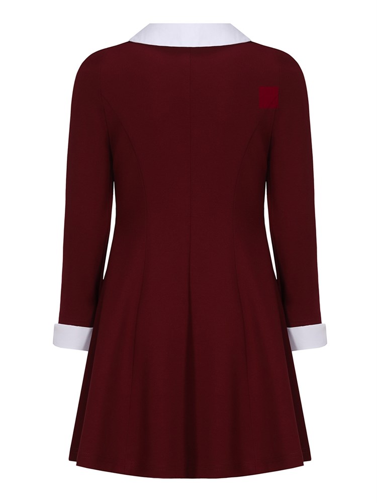 Платье с длинным рукавом, расклешенной юбкой, с декоративной молнией спереди. Украшено белым воротником-стойкой и белыми манжетами на рукавах; Состав: Вискоза - 60%, Нейлон - 35%, Эластан - 5%