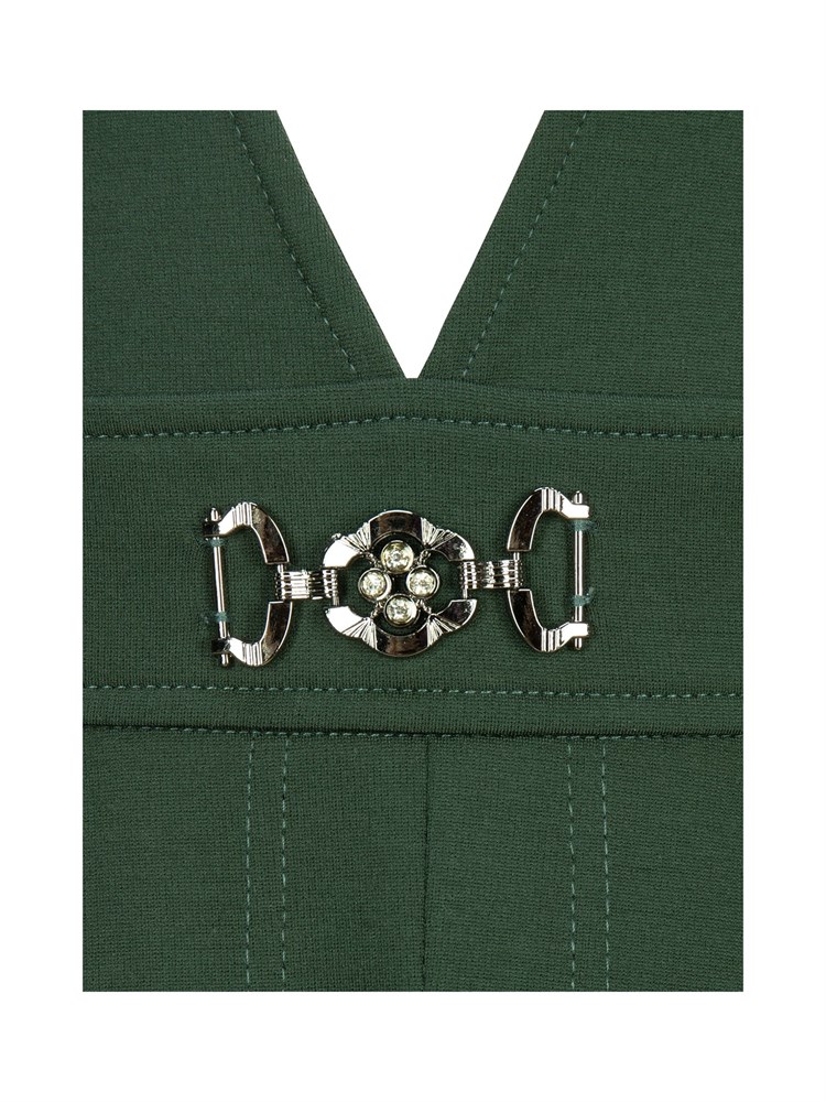 Cарафан с юбкой-шортами, на толстых лямках, перекрещивающихся на спине, с декоративной брошью со стразами на поясе; Состав: Вискоза - 60%, Нейлон - 35 %, Эластан - 5%.