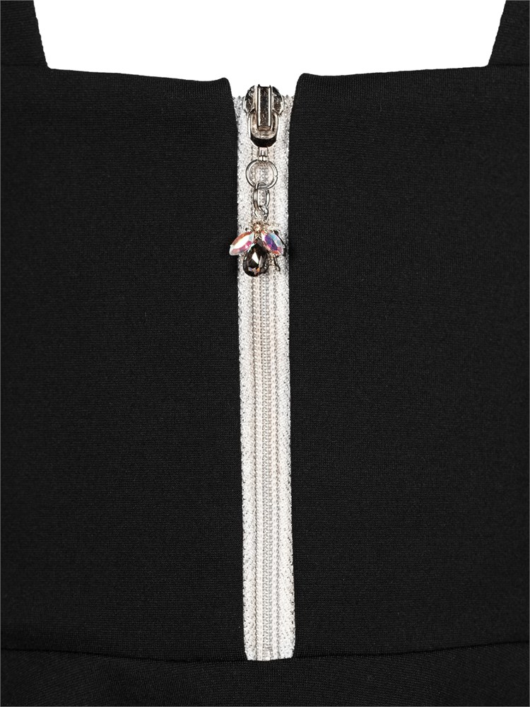 Сарафан с юбкой солнцеклеш. Застегивается спереди на декоративную молнию. Выполнен из трикотажного полотна; Состав: Вискоза - 60%, Нейлон - 35 %, Эластан - 5%.