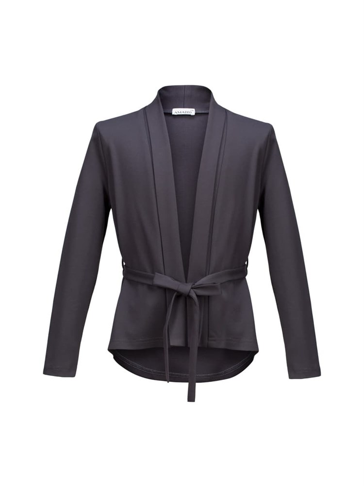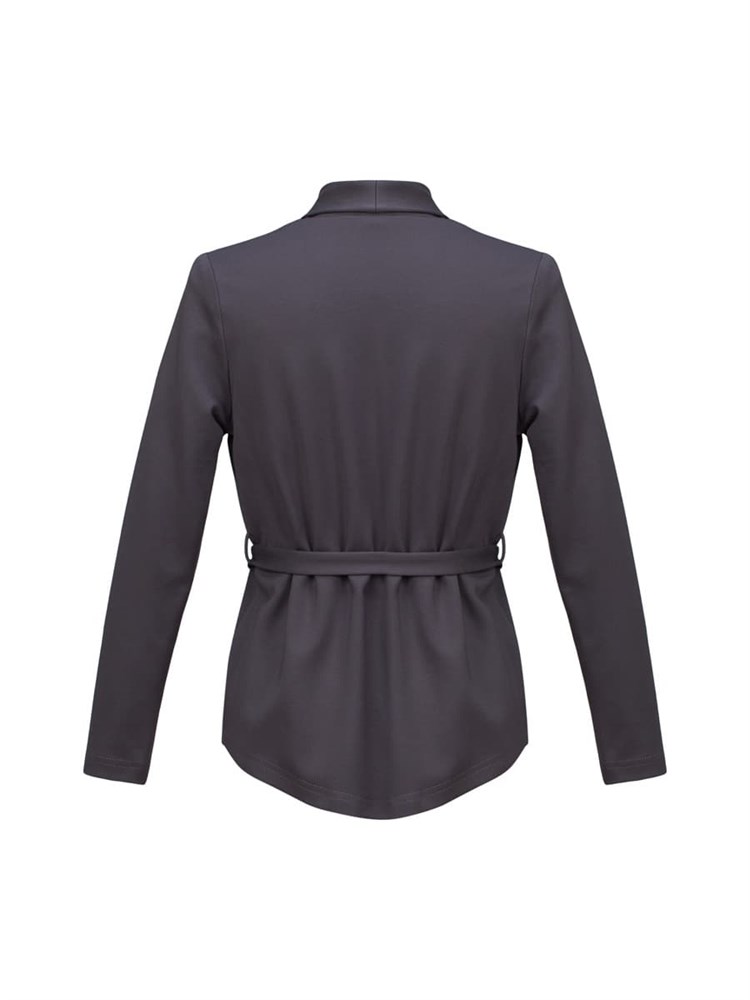 Жакет средней длины, с длинным рукавом, застегивается на съемный пояс из ткани. Без каких-либо декоративных элементов; Состав: Вискоза - 60%, Нейлон - 35%, Эластан - 5%