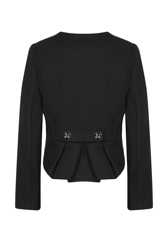 Укороченный жакет. Застегивается на декоративную серебристую молнию. Оригинальный пуллер в виде "мушки" со стразами. Подойдет как для повседневной носки в школу, так и на праздничный выход. Жакет держит форму и не мнется; Состав: Вискоза - 60%, Нейлон - 35%, Эластан - 5%