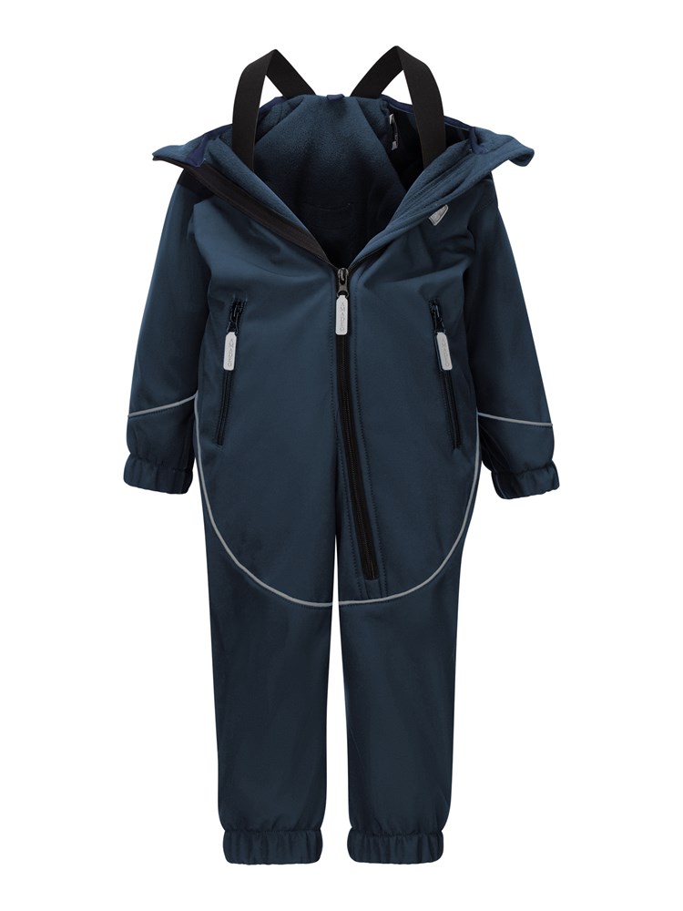 Комбинезон выполнен из материала «Софтшелл». Это высокотехнологичная трёхслойная дышащая ткань – мембрана утеплённая флисом. Отлично защищает от влаги и ветра. Светоотражающие элементы. Манжеты и пояс на резинке. Регулируемые штрипки. Для удобства ношения в помещении,предусмотрены внутренние лямки.Универсальный вариант для прогулок, активных игр и повседневного использования. Температурный режим от +3 до +18 градусов; Состав: Полиэстер - 95%, Эластан - 5%