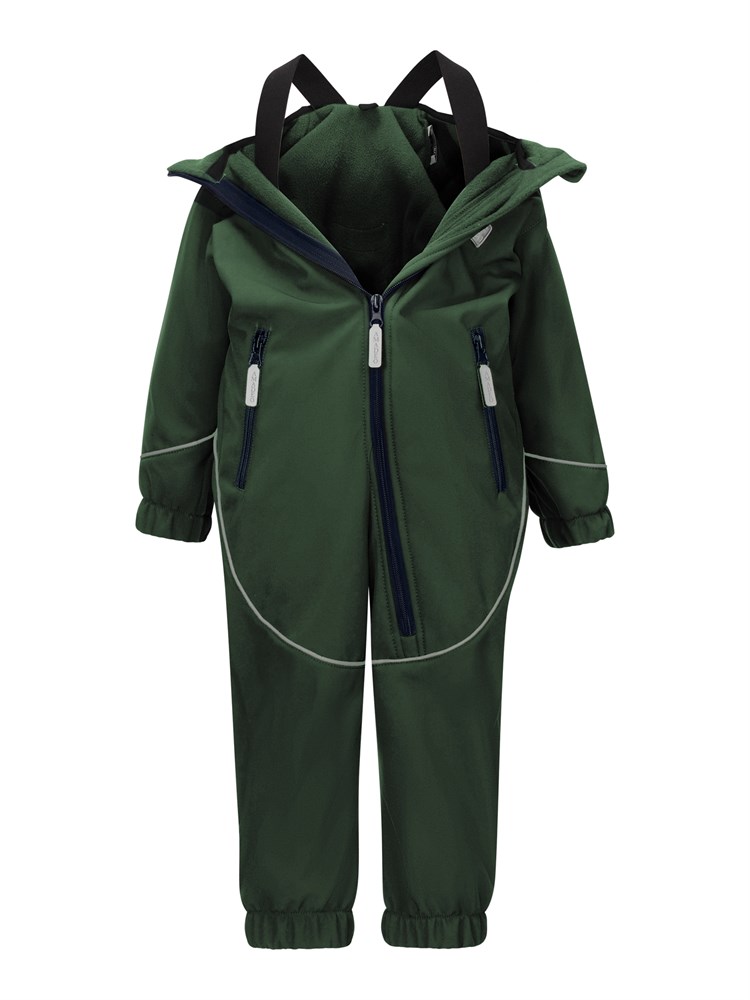 Комбинезон выполнен из материала «Софтшелл». Это высокотехнологичная трёхслойная дышащая ткань – мембрана утеплённая флисом. Отлично защищает от влаги и ветра. Светоотражающие элементы. Манжеты и пояс на резинке. Регулируемые штрипки. Для удобства ношения в помещении,предусмотрены внутренние лямки.Универсальный вариант для прогулок, активных игр и повседневного использования. Температурный режим от +3 до +18 градусов; Состав: Полиэстер - 95%, Эластан - 5%