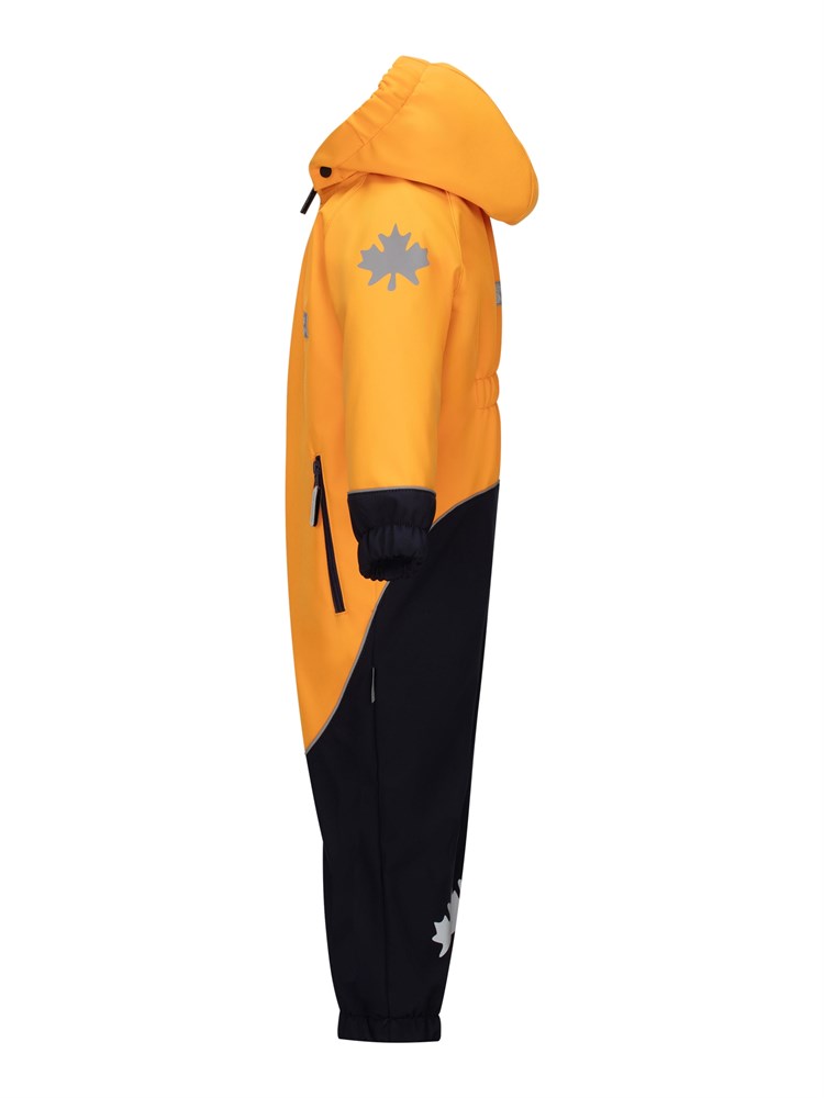 Комбинезон выполнен из материала «Софтшелл». Это высокотехнологичная трёхслойная дышащая ткань – мембрана утеплённая флисом. Отлично защищает от влаги и ветра. Светоотражающие элементы. Манжеты и пояс на резинке. Регулируемые штрипки. Для удобства ношения в помещении,предусмотрены внутренние лямки.Универсальный вариант для прогулок, активных игр и повседневного использования. Температурный режим от +3 до +18 градусов; Состав: Полиэстер - 95%, Эластан - 5%