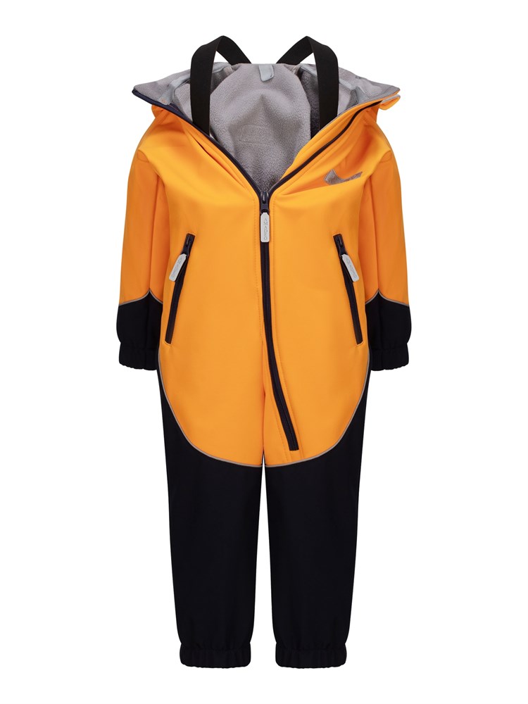 Комбинезон выполнен из материала «Софтшелл». Это высокотехнологичная трёхслойная дышащая ткань – мембрана утеплённая флисом. Отлично защищает от влаги и ветра. Светоотражающие элементы. Манжеты и пояс на резинке. Регулируемые штрипки. Для удобства ношения в помещении,предусмотрены внутренние лямки.Универсальный вариант для прогулок, активных игр и повседневного использования. Температурный режим от +3 до +18 градусов; Состав: Полиэстер - 95%, Эластан - 5%