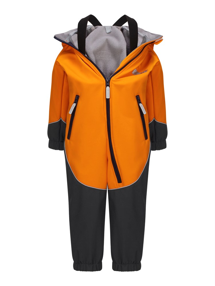 Комбинезон выполнен из материала «Софтшелл». Это высокотехнологичная трёхслойная дышащая ткань – мембрана утеплённая флисом. Отлично защищает от влаги и ветра. Светоотражающие элементы. Манжеты и пояс на резинке. Регулируемые штрипки. Для удобства ношения в помещении,предусмотрены внутренние лямки.Универсальный вариант для прогулок, активных игр и повседневного использования. Температурный режим от +3 до +18 градусов; Состав: Полиэстер - 95%, Эластан - 5%