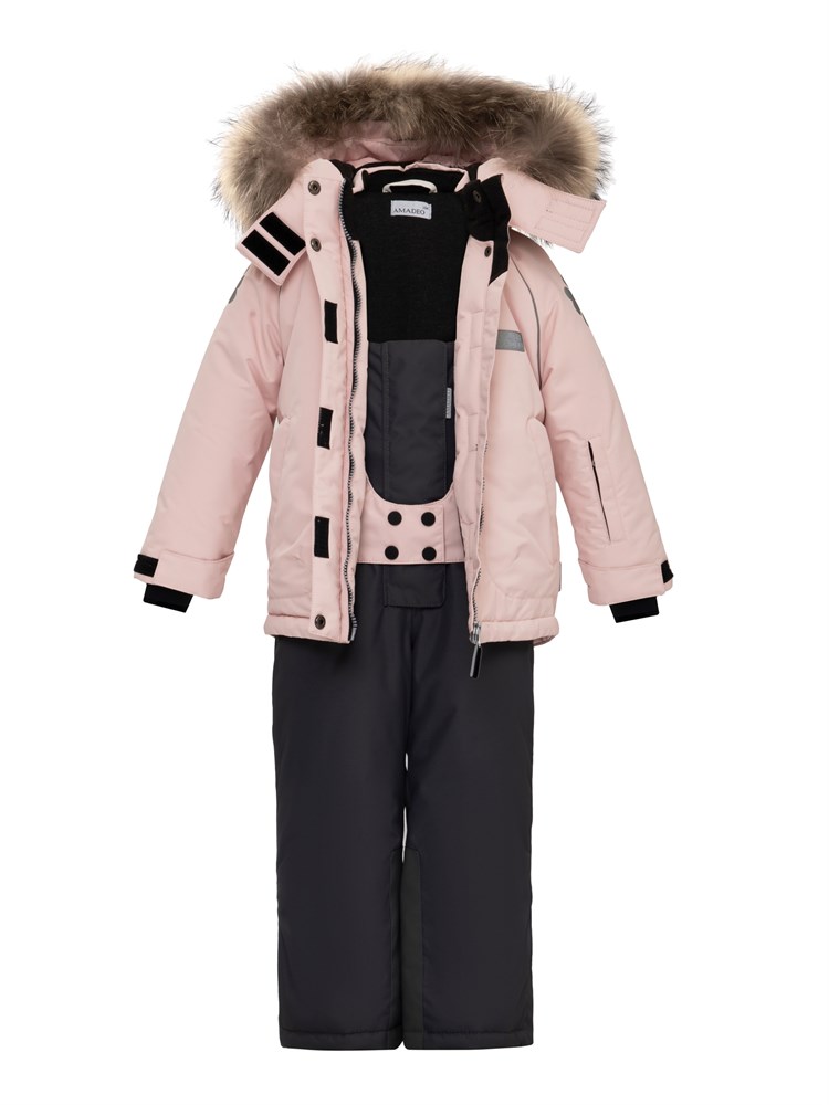 КОМПЛЕКТ: куртка + полукомбинезон. Прекрасный вариант для повседневной носки. КУРТКА из мембранной ткани с капюшоном, на капюшоне натуральная отстегивающаяся опушка, ветрозащита, капюшон отстёгивается на молнии и 2х кнопках, утягивается. Трикотажные манжеты в рукавах, одевающиеся на палец. Светоотражающие элементы на рукавах, светоотражающий кант, светоотражающие пуллеры для безопасности ребенка в темное время суток. Карманы на молнии. Внутренняя снежная юбка, как защита от попадания ветра и снега. ПОЛУКОМБИНЕЗОН С РЕГУЛИРУЕМЫМИ ЛЯМКАМИ, основные швы проклеены. Снегозащитные манжеты и силиконовые штрипки (длина меняется за счёт пуговиц) для фиксации брючины на обуви. Усиленная ткань В МЕСТАХ ПОВЫШЕННОГО ТРЕНИЯ. Комфортная температура эксплуатации до -20С. Водонепроницаемость 7000 мм. водного столба. Паропроницаемость 9000 гр/м. кВ/24 часа. Подкладка 1. 70% хлопок. 30% полиэстер (ТРИКОТАЖ); 2. 52% вискоза, 48% полиэстер (в рукавах и штанинах). Утеплитель SHELTER 200 гр. в куртке и 150 гр. в полукомбинезоне.