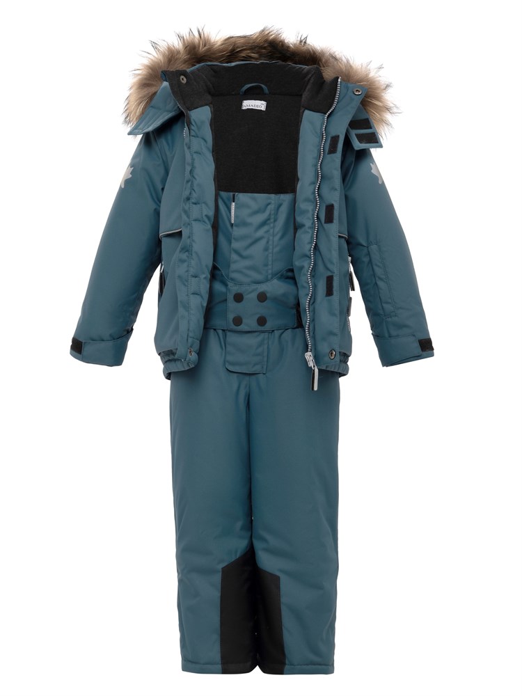 КОМПЛЕКТ: куртка + полукомбинезон. Прекрасный вариант для повседневной носки. КУРТКА из мембранной ткани с капюшоном, на капюшоне натуральная отстегивающаяся опушка, ветрозащита, капюшон отстёгивается на молнии и 2х кнопках, утягивается. Трикотажные манжеты в рукавах, одевающиеся на палец. Светоотражающие элементы на рукавах, светоотражающий кант, светоотражающие пуллеры для безопасности ребенка в темное время суток. Карманы на молнии. Внутренняя снежная юбка, как защита от попадания ветра и снега. ПОЛУКОМБИНЕЗОН С РЕГУЛИРУЕМЫМИ ЛЯМКАМИ, основные швы проклеены. Снегозащитные манжеты и силиконовые штрипки (длина меняется за счёт пуговиц) для фиксации брючины на обуви. Усиленная ткань В МЕСТАХ ПОВЫШЕННОГО ТРЕНИЯ. Комфортная температура эксплуатации до -20С. Водонепроницаемость 7000 мм. водного столба. Паропроницаемость 9000 гр/м. кВ/24 часа. Подкладка 1. 70% хлопок. 30% полиэстер (ТРИКОТАЖ); 2. 52% вискоза, 48% полиэстер (в рукавах и штанинах). Утеплитель SHELTER 200 гр. в куртке и 150 гр. в полукомбинезоне.