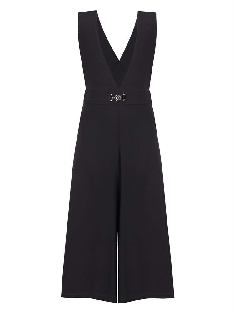 Комбинезон без рукавов, с расклешенными брюками, на толстых лямках, перекрещивающихся на спине, с декоративной брошью со стразами на поясе; Состав: Вискоза - 60%, Нейлон - 35 %, Эластан - 5%.