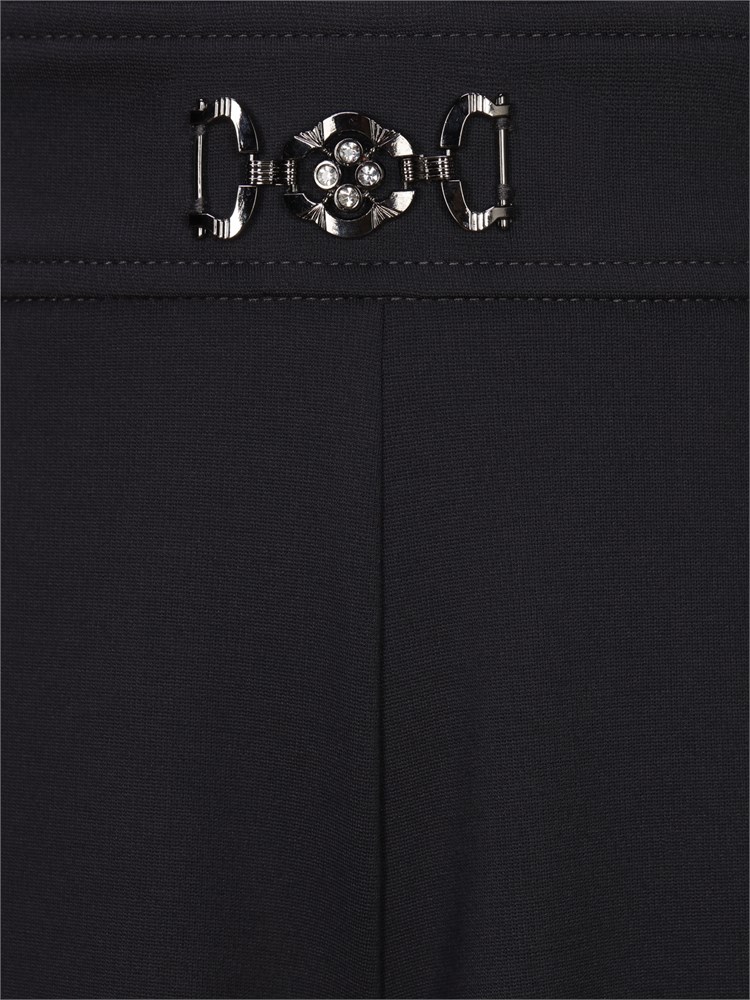 Комбинезон без рукавов, с расклешенными брюками, на толстых лямках, перекрещивающихся на спине, с декоративной брошью со стразами на поясе; Состав: Вискоза - 60%, Нейлон - 35 %, Эластан - 5%.