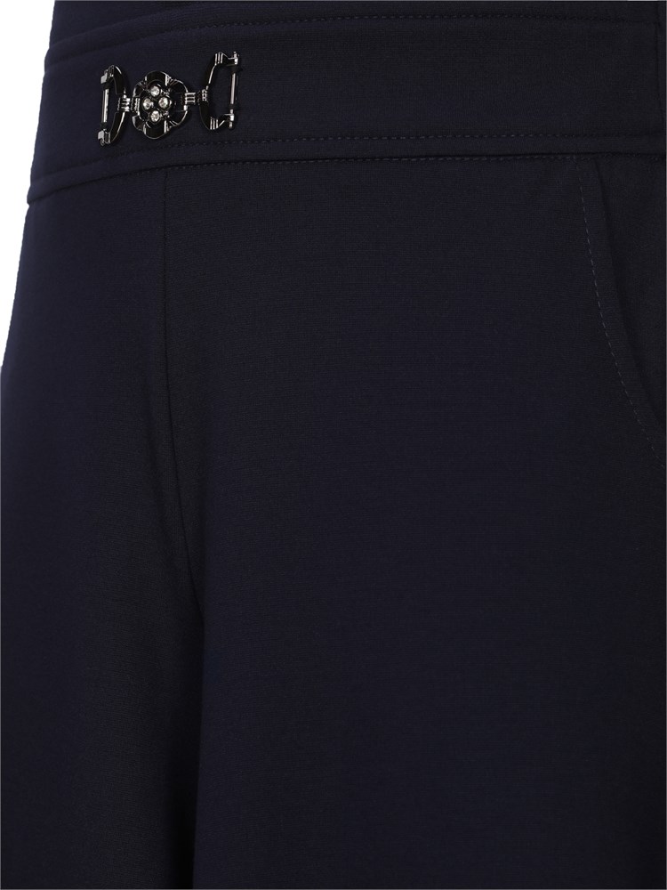 Комбинезон без рукавов, с расклешенными брюками, на толстых лямках, перекрещивающихся на спине, с декоративной брошью со стразами на поясе; Состав: Вискоза - 60%, Нейлон - 35 %, Эластан - 5%.