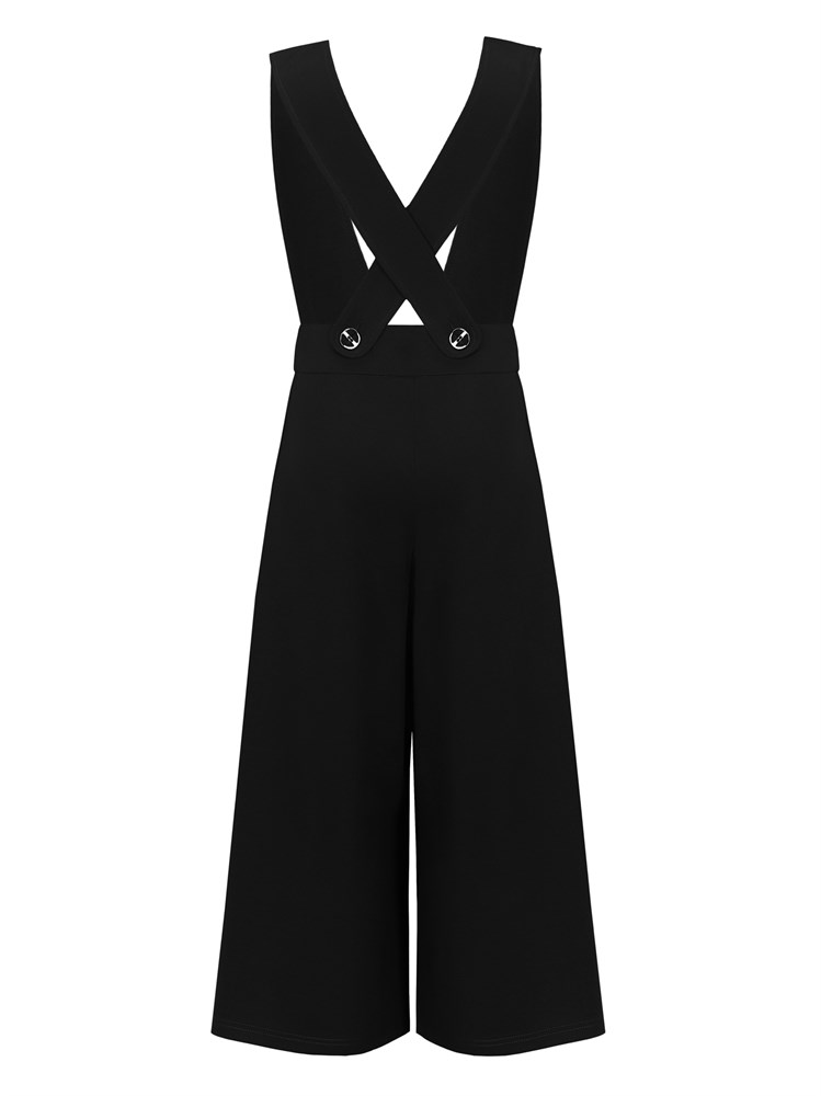 Комбинезон без рукавов, с расклешенными брюками, на толстых лямках, перекрещивающихся на спине, с декоративной брошью со стразами на поясе; Состав: Вискоза - 60%, Нейлон - 35 %, Эластан - 5%.