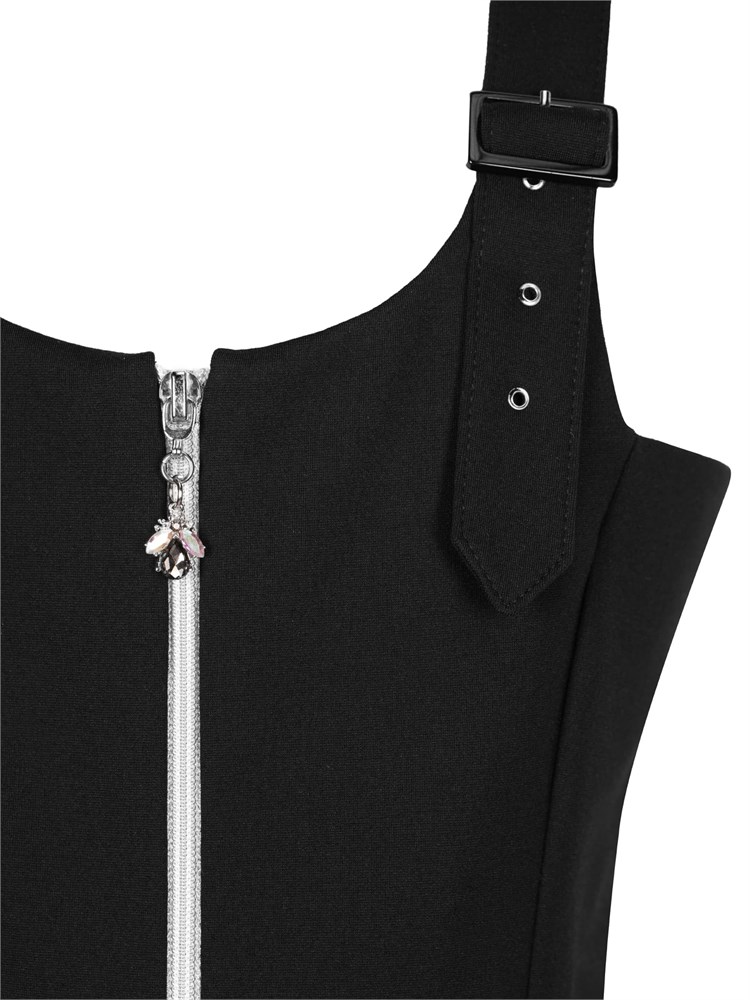 Комбинезон выполнен из трикотажного полотна. С карманами. Лямки регулируются. Застегивается на декоративную серебристую молнию; Состав: Вискоза - 60%, Нейлон - 35 %, Эластан - 5%.