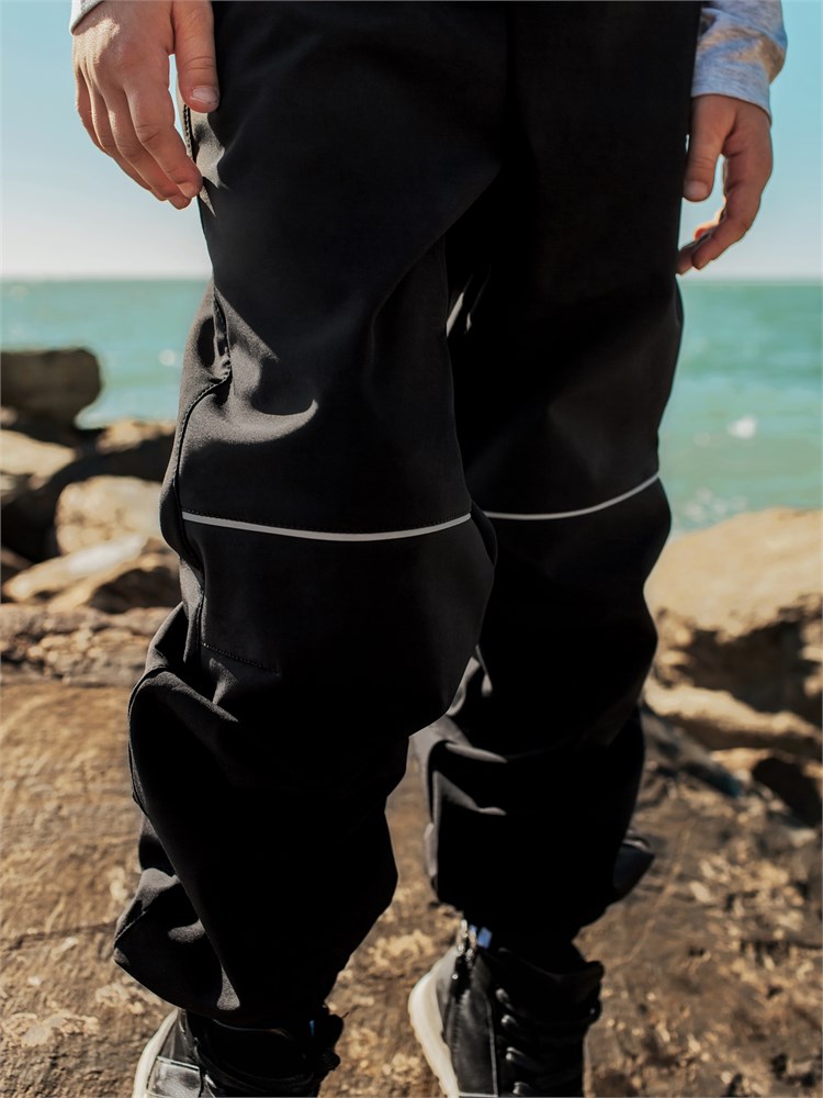 Брюки выполнены из материала «Софтшелл». Это высокотехнологичная трёхслойная дышащая ткань – мембрана утеплённая флисом. Отлично защищает от влаги и ветра. Светоотражающие элементы. Манжеты и пояс на резинке + дополнительная утяжка с фиксатором. Универсальный вариант для прогулок, активных игр и повседневного использования. Температурный режим от +3 до +18 градусов; Состав: 95% полиэстер, 5% эластан