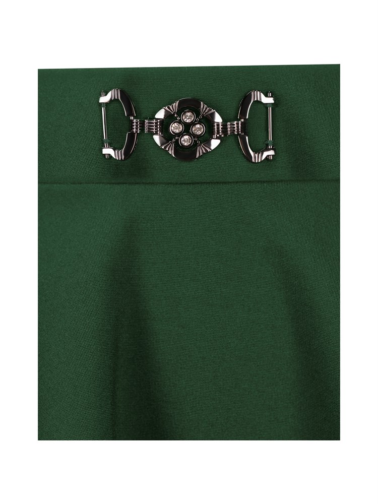 Юбка солнце-клеш, длина - мини (выше колена) с декоративной пряжкой на поясе. Выполнена из трикотажного полотна; Состав: Вискоза - 60%, Нейлон - 35 %, Эластан - 5%.