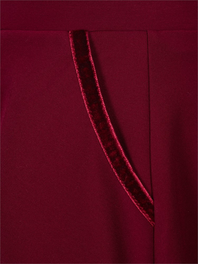 Юбка выполнена из трикотажного полотна. С карманами, отделанными бархатом. Пояс на резинке, без застежки. Полусолнце; Состав: Вискоза - 60%, Нейлон - 35 %, Эластан - 5%.