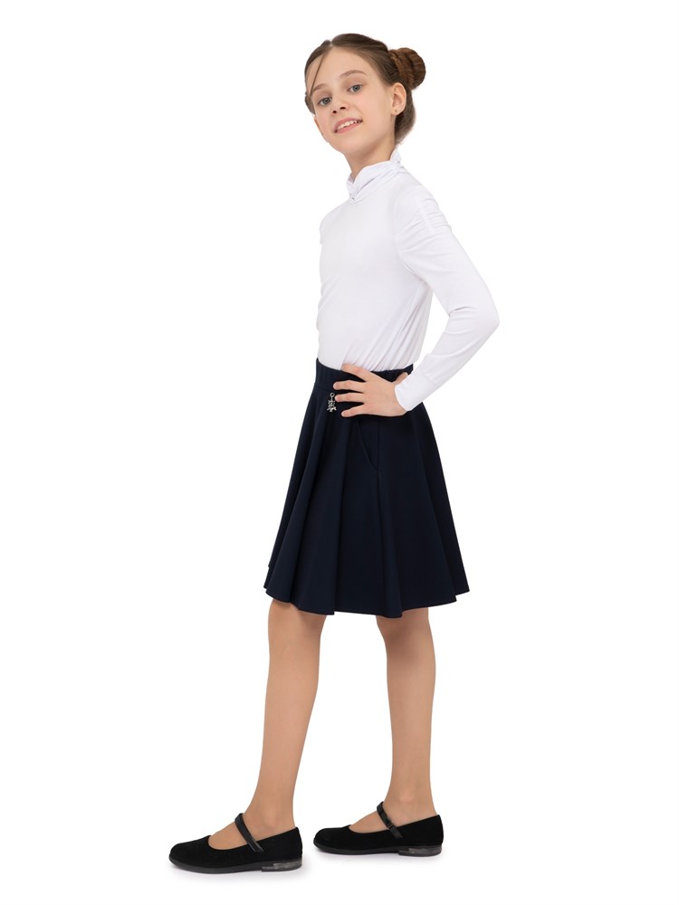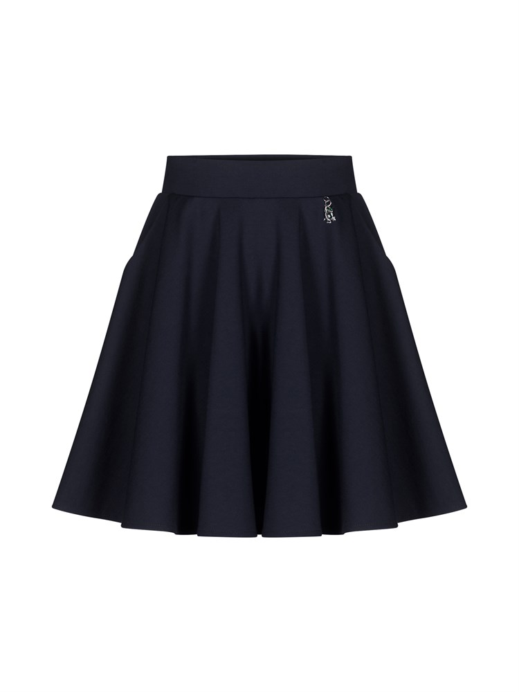 Юбка солнцеклеш, с поясом. С карманами, без застежки. К поясу пришито украшение в виде"совы". Выполнена из трикотажного полотна; Состав: Вискоза - 60%, Нейлон - 35 %, Эластан - 5%.
