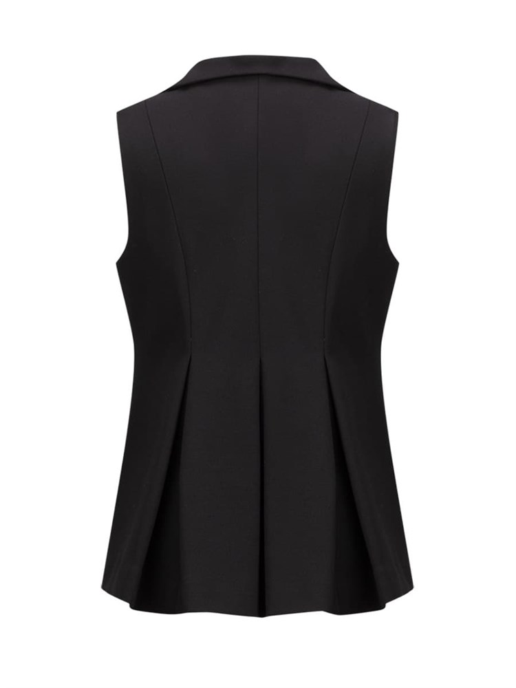 Удлиненный жилет с прорезными карманами на пуговицах, воротник украшен декоративной брошью в виде совы со стразами; Состав: Вискоза - 60%, Нейлон - 35 %, Эластан - 5%.